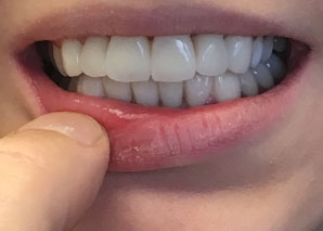 L’ensemble de l'arcade dentaire a été blanchi et des couronnes ont été posées sur les dents de devant.